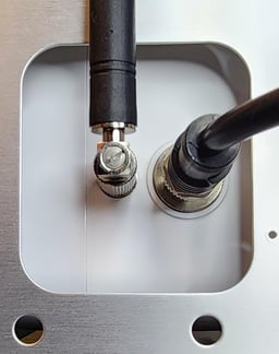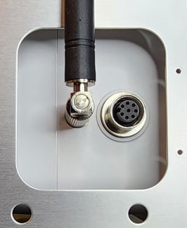 - Unscrew the cap covering the module port and plug the accessory cable into the Clarity Node-S body by aligning the cable pins and tightening the threaded connector nut several turns until finger-tight; do not use a wrench. Ensure the adjacent Node antenna connector is also finger-tight and the antenna is pointing vertically up.